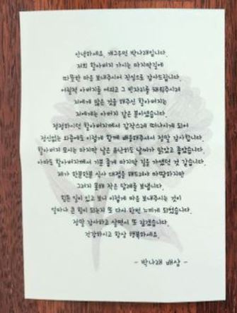 장례식 이후 박나래는 슬픔을 함께해준 동료들과 지인들에게 감사의 뜻을 전하기 위하여 정성이 담김 답례품을 준비하고 편지도 전달했다고 합니다.